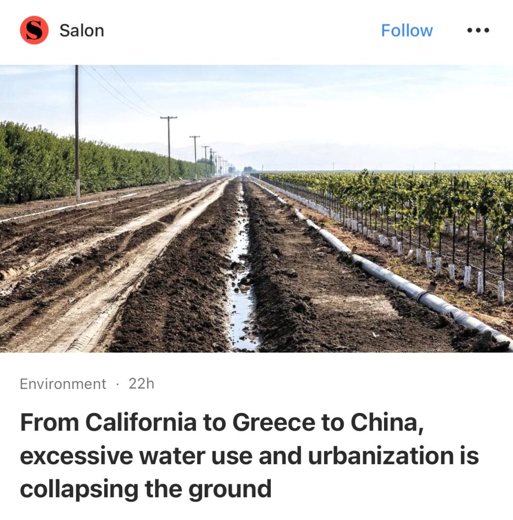 15。据《科学》杂志的分析,数十个中国城市,正在慢慢下沉。这种地球表面下沉的现象不仅限于中国。从加利福尼亚到希腊,人类活动使我们脚下的土地比以往任何时候都更加脆弱。
