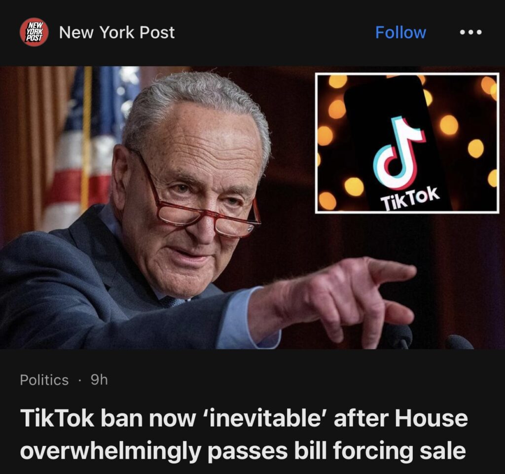 7。据New York Post报道,知情人士称,众议院以压倒性多数通过了一项法案,将禁止 TikTok 在美国上市,除非其中国所有者从该公司撤资,这使得该法案的最终通过“不可避免”。