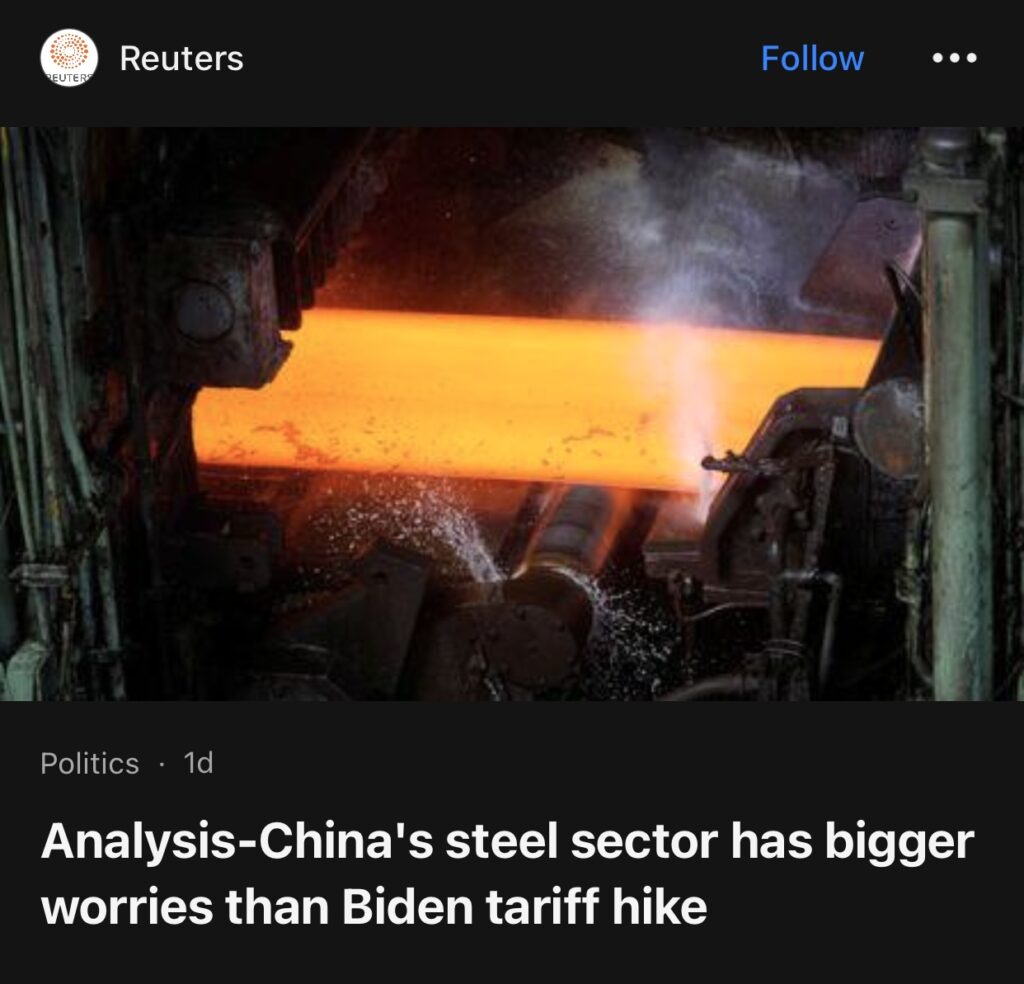 6。据北京/新加坡路透社报道,美国总统乔·拜登推动对中国钢铁进口征收三倍关税,这对这个行业来说是一个象征性的打击。但该行业面临着对当地需求疲软的更大担忧,以及中国激增的出口面临更强烈打击的威胁。
