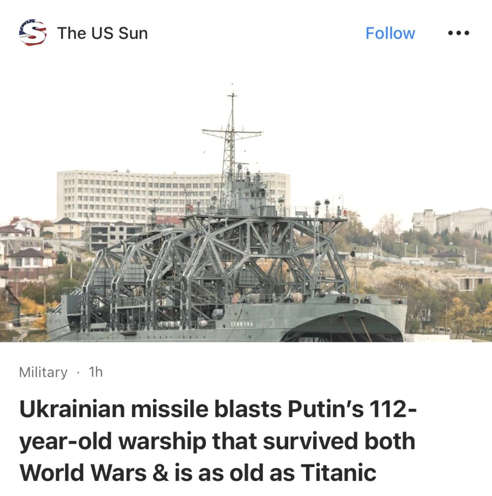 8。据The US Sun报道,乌克兰导弹击中了普京拥有112 年历史的军舰。这艘军舰在两次世界大战中幸存下来,与泰坦尼克号一样古老。