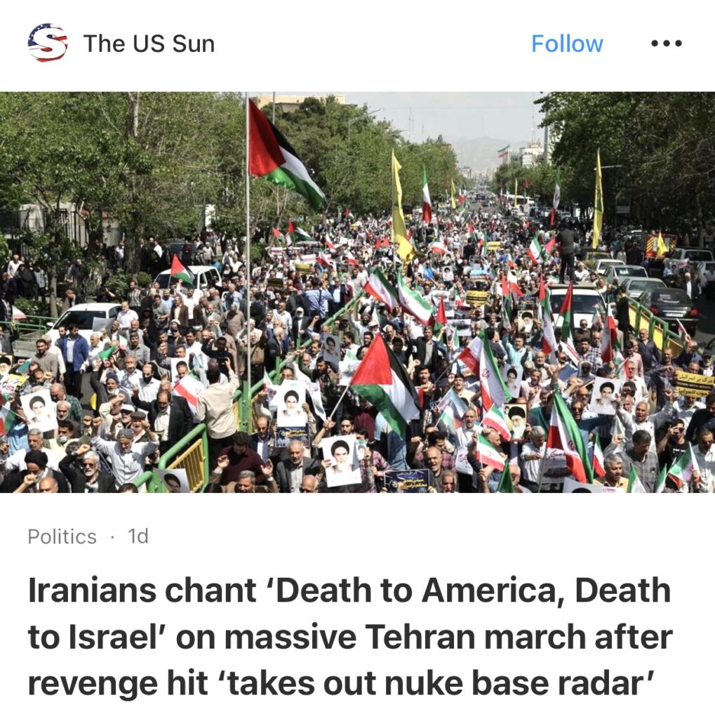 12。据The US Sun报道,以色列复仇性袭击“摧毁了伊朗核武器基地雷达”后,伊朗人在德黑兰举行大规模游行,高呼“美国去死,以色列去死”。