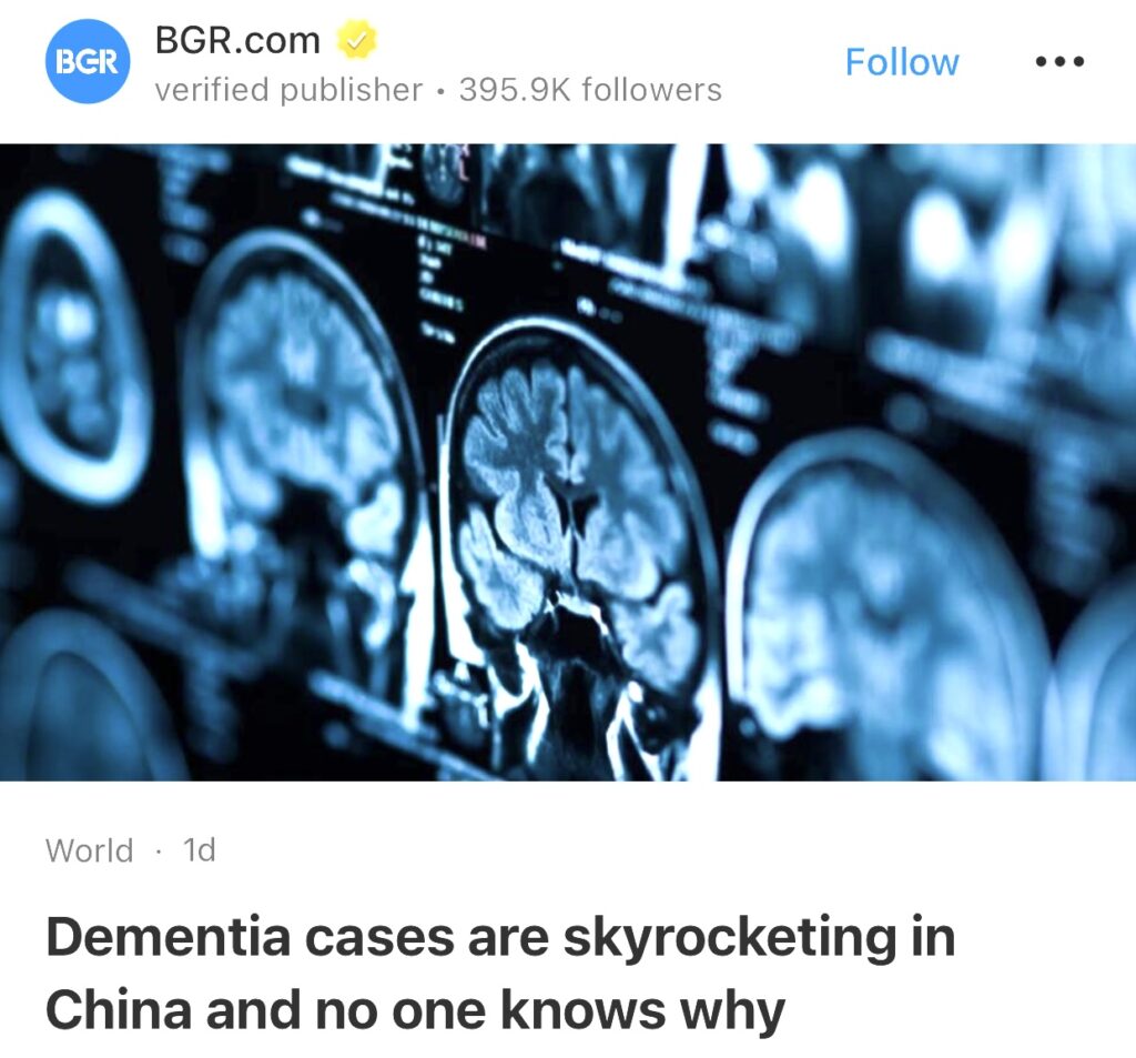 15。据BGR.com报道,中国老年痴呆症病例激增,但没人知道原因。世界各地的痴呆症发病率都在上升。但在中国,痴呆症的发病率更是达到了惊人的新高,专家们正在努力探究其中的原因。最近的一项全球研究发现,过去三十年里,中国的痴呆症病例增长了四倍多,超过了大多数其他国家。1990年,中国约有400万人患有痴呆症。到2021年,这一数字飙升至近1700万人。