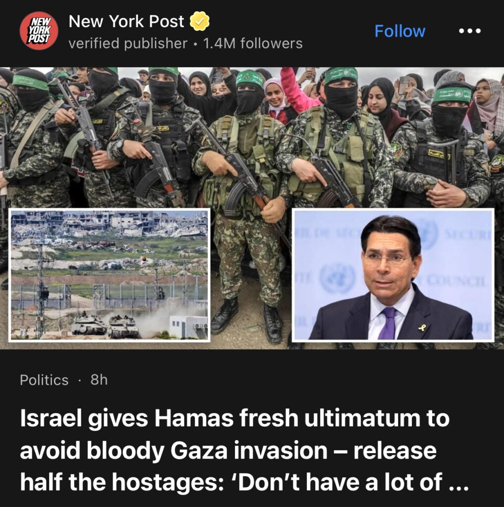 4。据New York Post报道,以色列向哈马斯发出新的最后通牒,要求其避免血腥入侵加沙地带。仅释放一半人质:“我们没有太多时间了”