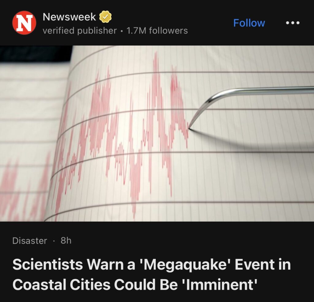2。据Newsweek报道,科学家警告称沿海城市可能即将发生“特大地震”。西海岸的地震尤其危险,因为该地区位于卡斯卡迪亚俯冲带,这是一条断层线,胡安德富卡板块正缓慢地滑向北美板块之下。