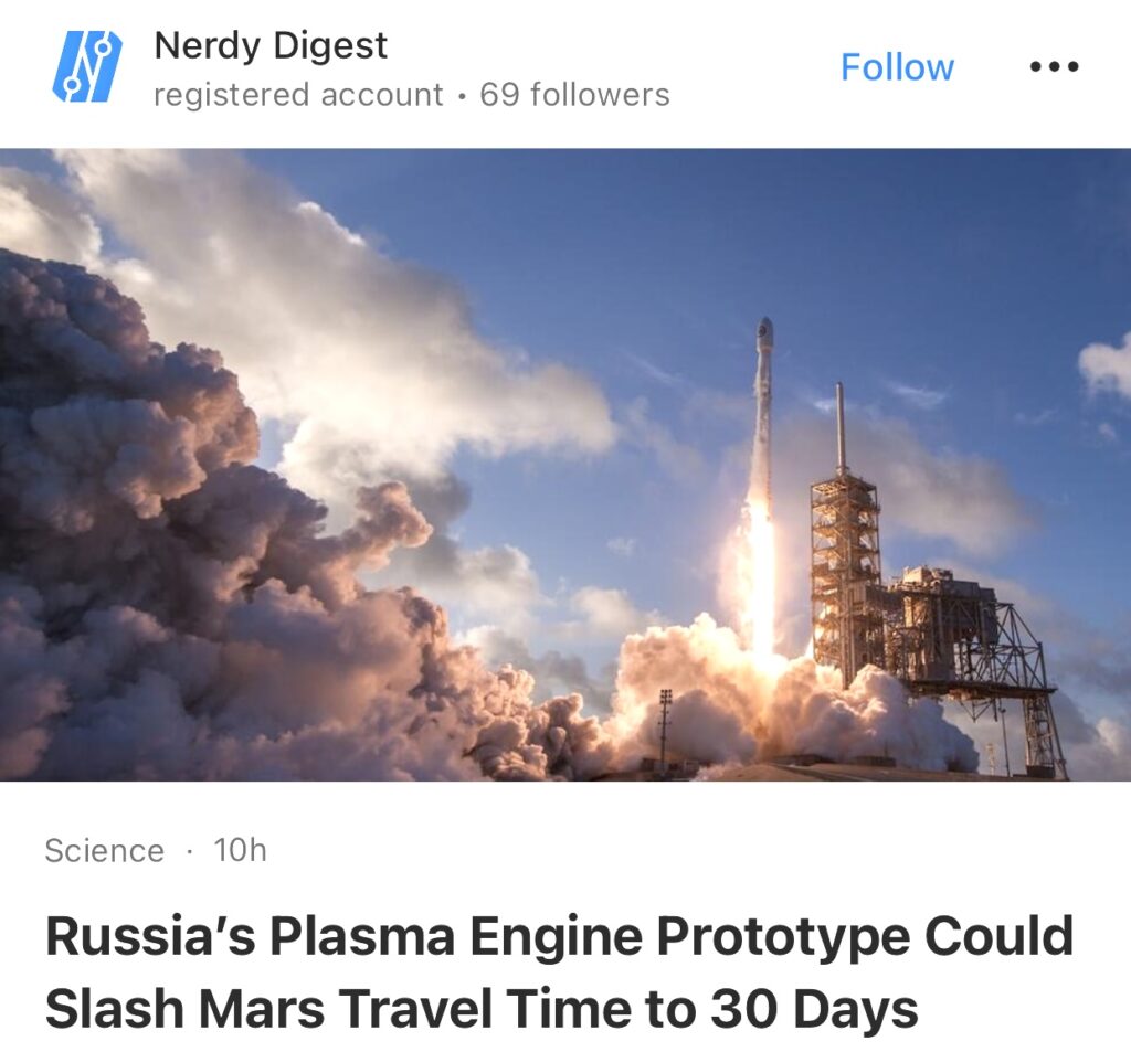 8。据Nerdy Digest报道,俄罗斯等离子发动机原型可将火星旅行时间缩短至 30 天。