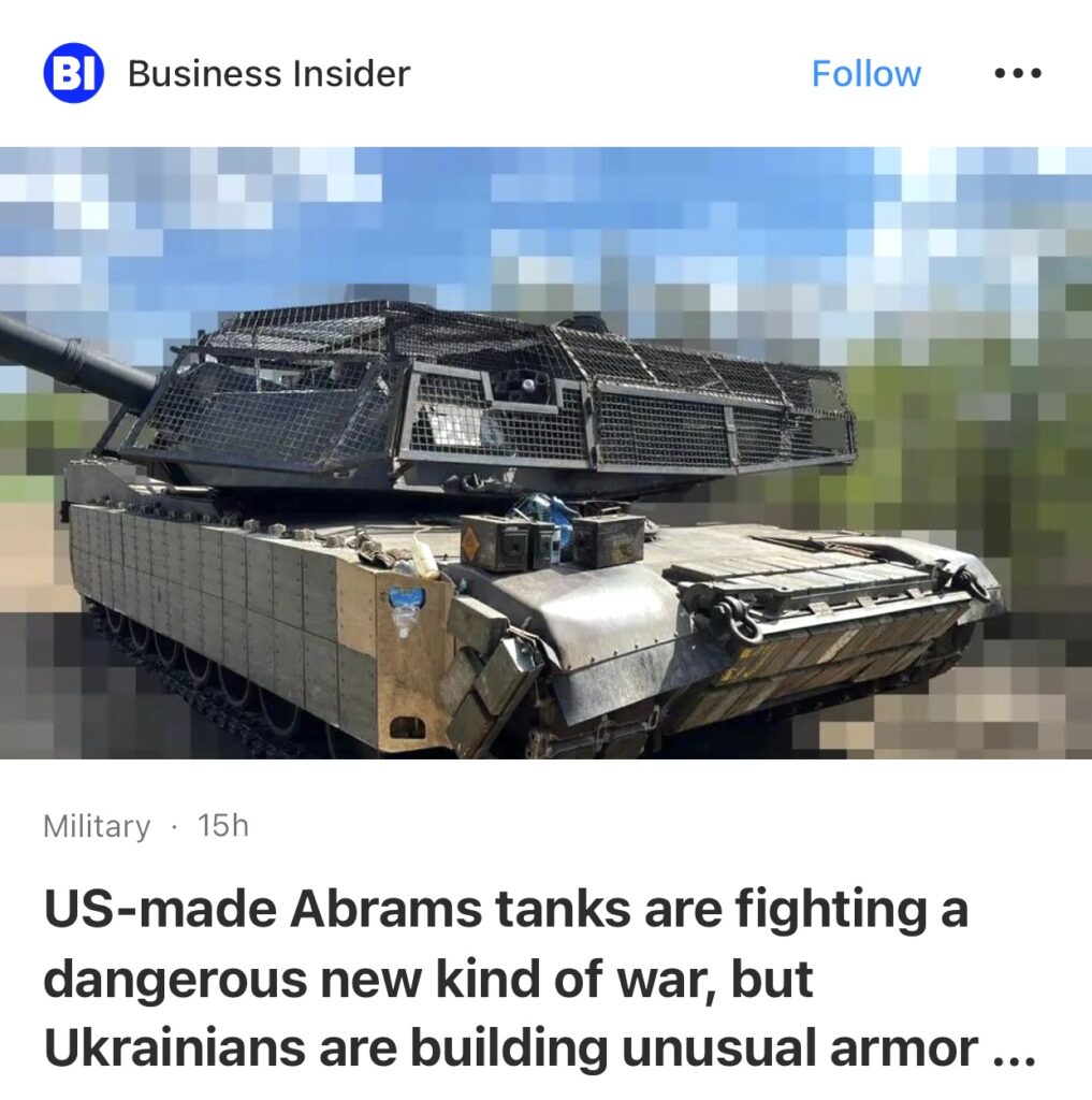 14。据Business Insider报道,美国制造的艾布拉姆斯坦克正在打一场危险的新型战争。他们正在对抗莫斯科的致命爆炸无人机武器库,这是一场陌生的战争。但乌克兰人正在建造不寻常的装甲来帮助他们生存。