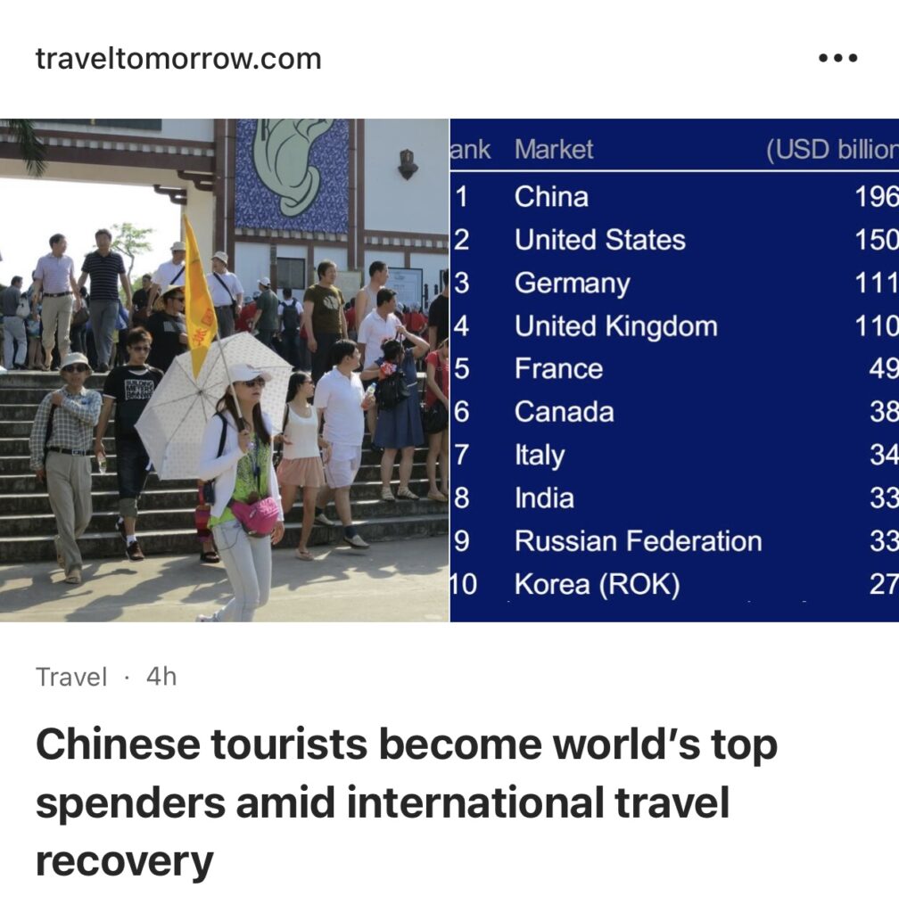 12。据TravelTomorrow 报道,随着国际旅游复苏,中国游客成为全球最大的消费群体。2023 年,中国游客在海外消费了 1,965 亿美元,比最接近的竞争对手美国高出了 450 亿美元。其余前几名分别是德国游客(1120 亿美元)、英国游客(1100 亿美元)和法国(490 亿美元)。