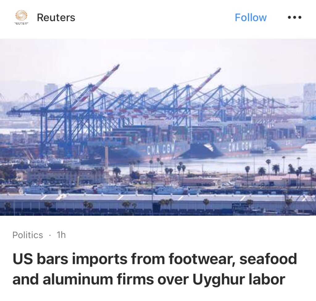 6。据华盛顿路透社报道,美国已将另外三家公司添加到实体名单中,该名单禁止从涉嫌在中国强迫维吾尔人劳动的公司进口产品。