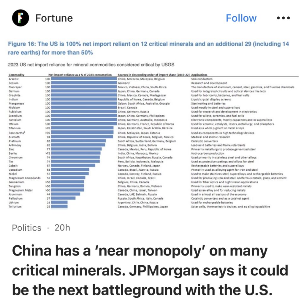 4。据Fortune报道,摩根大通表示,中国对许多关键矿产拥有“近乎垄断”。这可能是与美国的下一个战场。