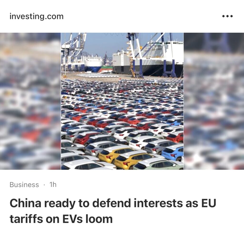 15。据北京路透社报道,中国外交部表示,在有报纸报道欧盟委员会将对进口中国电动汽车(EV)征收高达25%的关税后,中国将采取一切必要措施“坚决维护”自己的合法权益。经过长达八个月的调查后,负责监督欧盟 27 个国家贸易政策的欧盟委员会预计将在周三通知汽车制造商,将从下个月开始对进口中国电动汽车临时征收高达 25% 的额外关税。