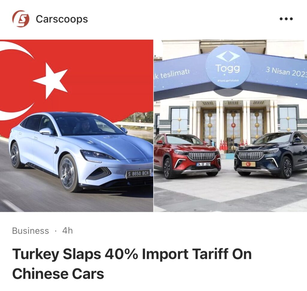 7。据CarScoops 报道,中国汽车进口到土耳其将被征收40%的关税。对于关税低于 7,000 美元的较便宜汽车,将征收 7,000 美元的固定关税。此举旨在保护土耳其当地工业,避免国家贸易平衡恶化。