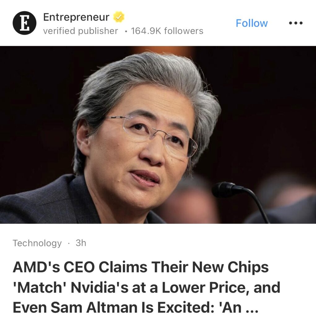 2。据Entrepreneur 报道,AMD 首席执行官声称他们的新芯片以更低的价格“匹敌”Nvidia,就连 Sam Altman 也兴奋不已:“这是一件了不起的事情”。