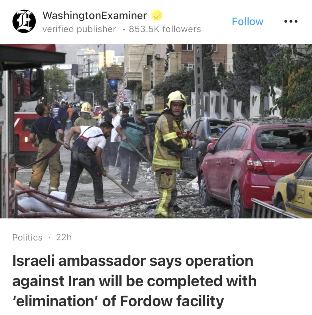 13。据WashingtonExaminer报道,以色列大使称针对伊朗的行动将以“摧毁”福尔多设施终结。“福尔多是主要地点,位于地下很深很深的地方,浓缩铀和武器在这里组装、结合,构成最大的危险。”