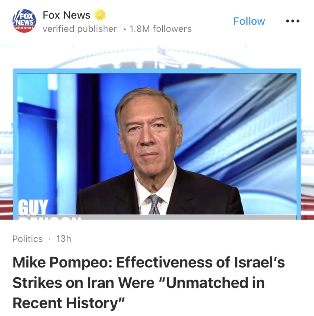 4。据Fox News报道,美国前国务卿兼中央情报局局长迈克·蓬佩奥称,以色列对伊朗打击的有效性“在近代历史上无与伦比”。
