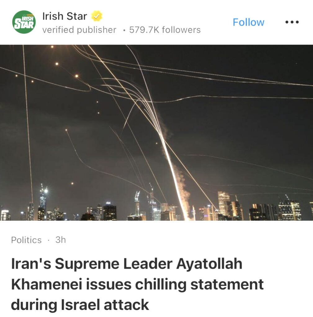 1。据Irish Star报道,伊朗最高领袖哈梅内伊在以色列袭击事件中发表令人不寒而栗的声明。在塔斯尼姆通讯社发表的声明中,阿亚图拉哈梅内伊宣称,伊朗武装部队将使“邪恶的犹太复国主义政权陷入痛苦”。