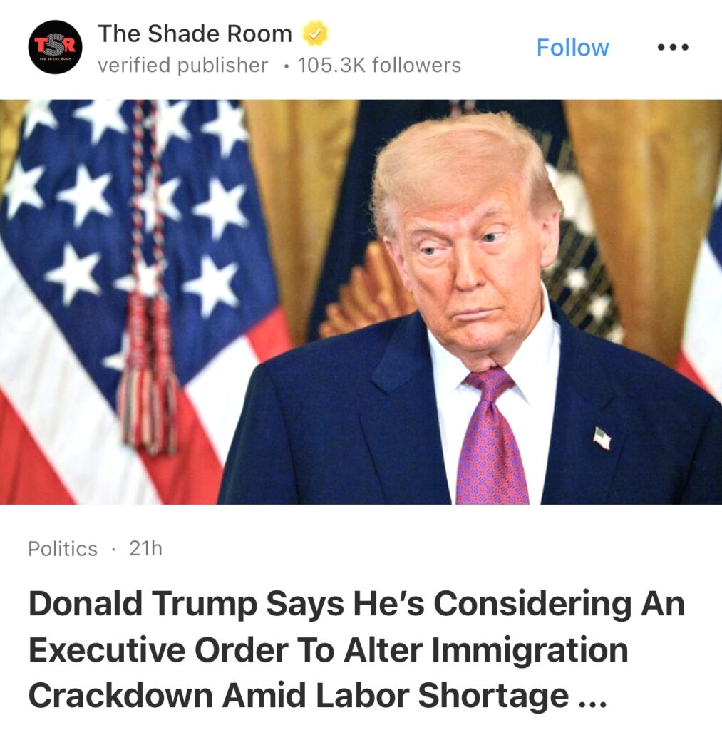 14。据The Shade Room报道,唐纳德·特朗普表示,他正在考虑发布行政命令,以改变对移民的打击,以应对劳动力短缺问题。