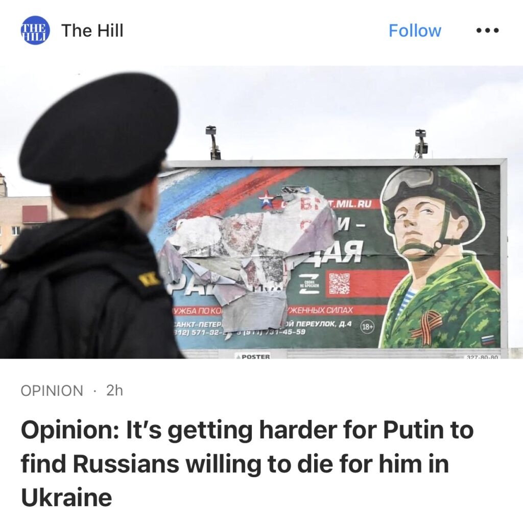 5。据The Hill报道,普京越来越难找到愿意在乌克兰为他献身的俄罗斯人。军事博主和普通士兵越来越多地发布前线可怕状况的详细视频。俄罗斯国防部的人事变动也暗示官方承认事情的进展并不像克里姆林宫宣传所坚称的那样。俄罗斯人终于失去了在乌克兰速战速决的胃口。
