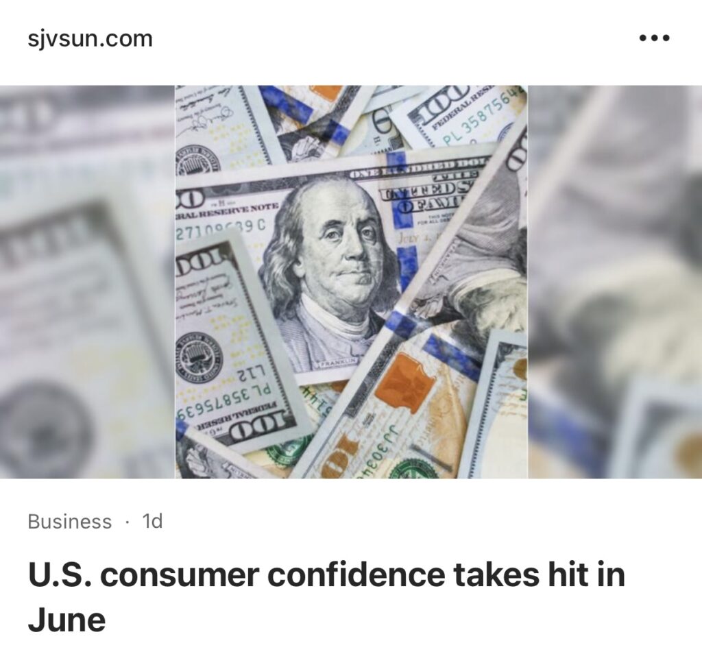 1。据The Sun 报道,随着美国人对近期前景表示担忧,六月份的经济增速有所下降,美国消费者信心也有所下降。世界大型企业联合会报告称,6月份消费者信心指数从5月份的101.3下降至100.4,但略好于分析师的预期。