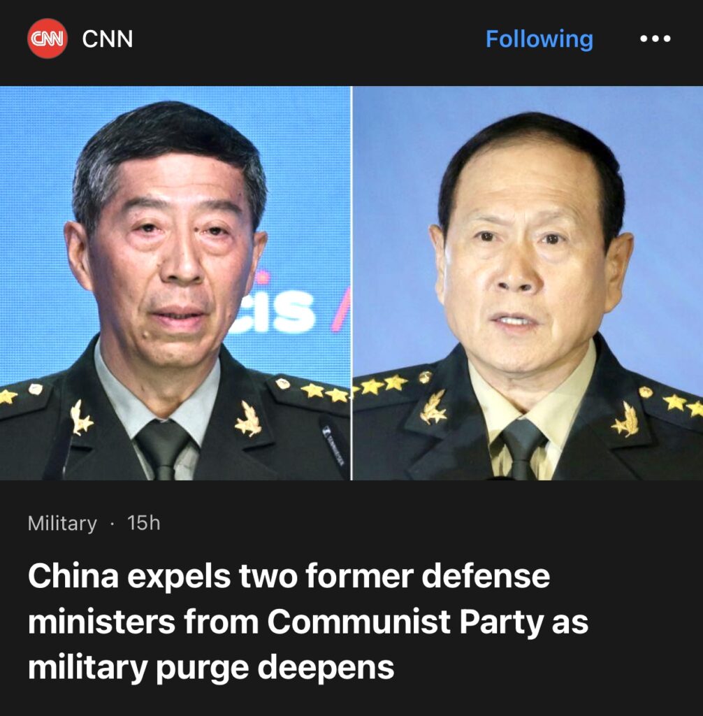 7。据CNN 报道,中国中央电视台报道,中国周四因腐败指控将前国防部长李尚福及其前任开除出执政的共产党,加深了对军队高层的全面清洗。