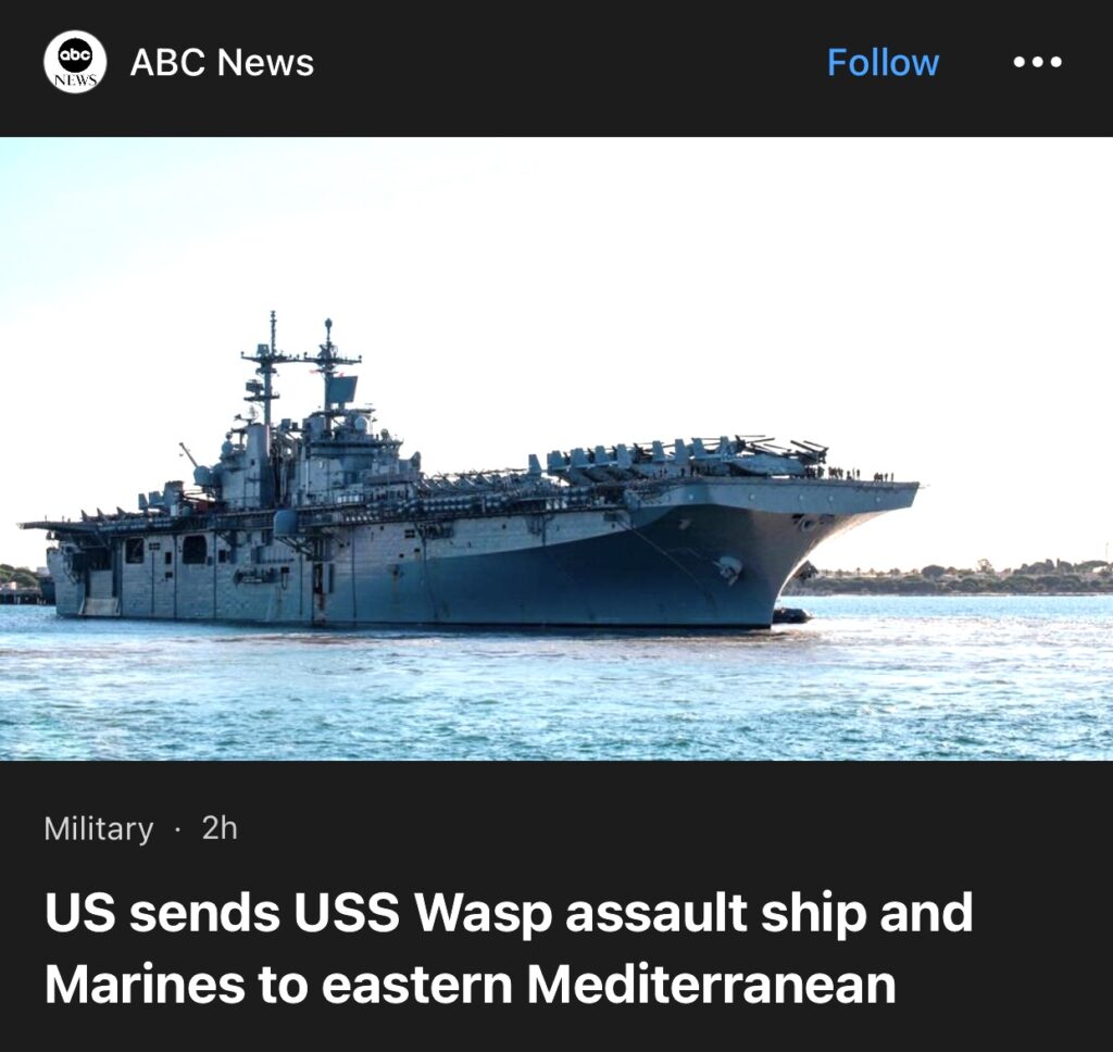 8。据ABC News报道,在真主党和以色列在黎巴嫩边境沿线的紧张局势继续升级之际,美国海军两栖攻击舰黄蜂号和船上的海军陆战队正在被派往地中海东部,以起到威慑作用并为美国提供支持。