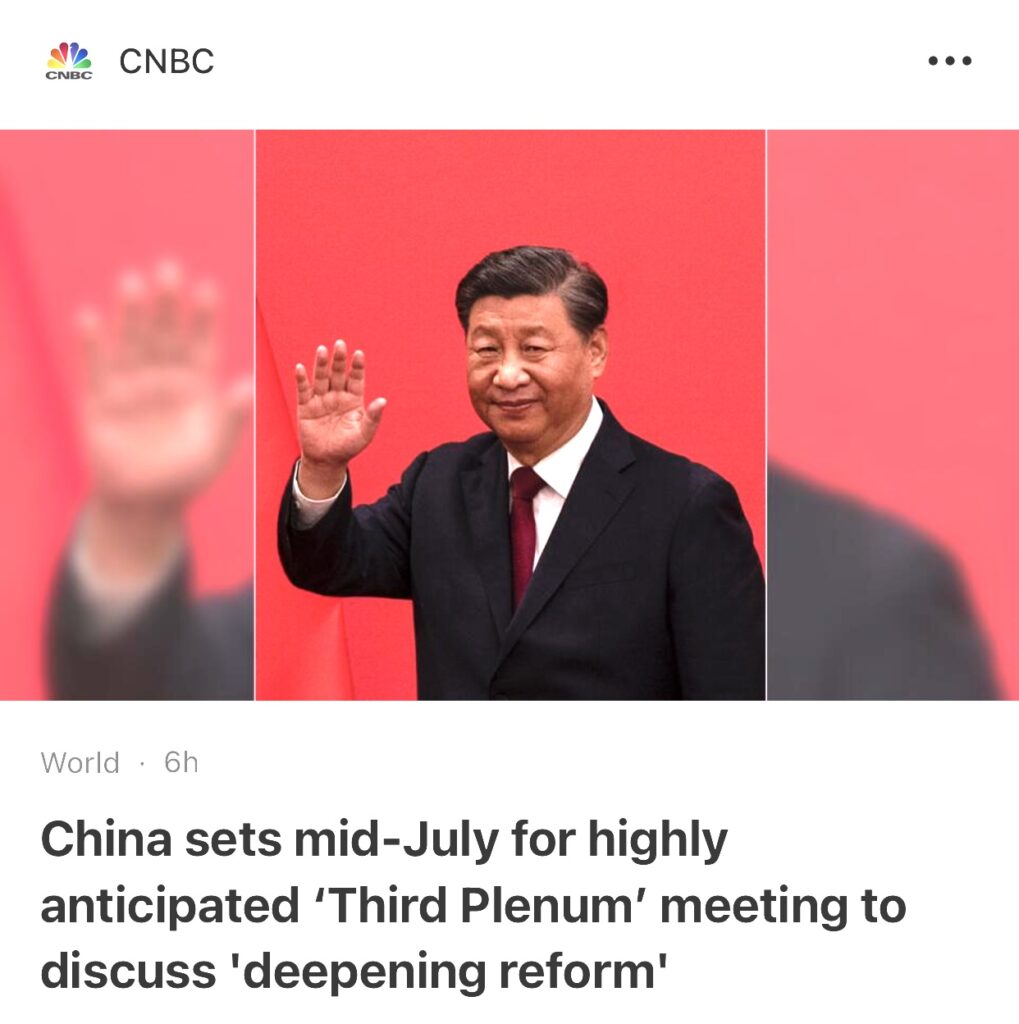 4。据CNBC 报道,中国定于7月中旬召开备受期待的“三中全会”,将讨论“深化改革”。据官方媒体报道,中国最高领导人将于 7 月 15 日至 18 日召开备受期待的三中全会。