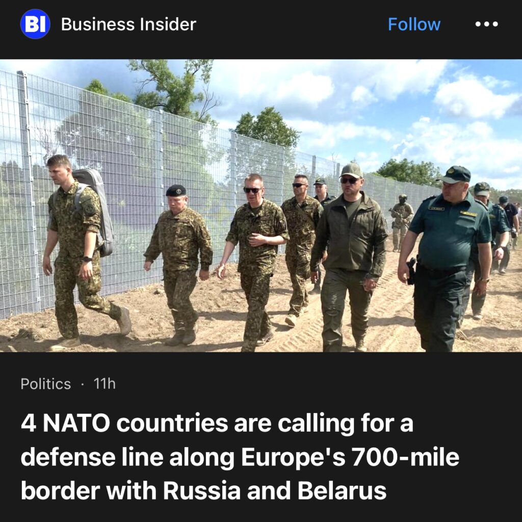 12。据Business Insider 报道,4个北约国家拉脱维亚、立陶宛、爱沙尼亚和波兰呼吁在欧洲与俄罗斯和白俄罗斯的700英里边界上建立防线。
