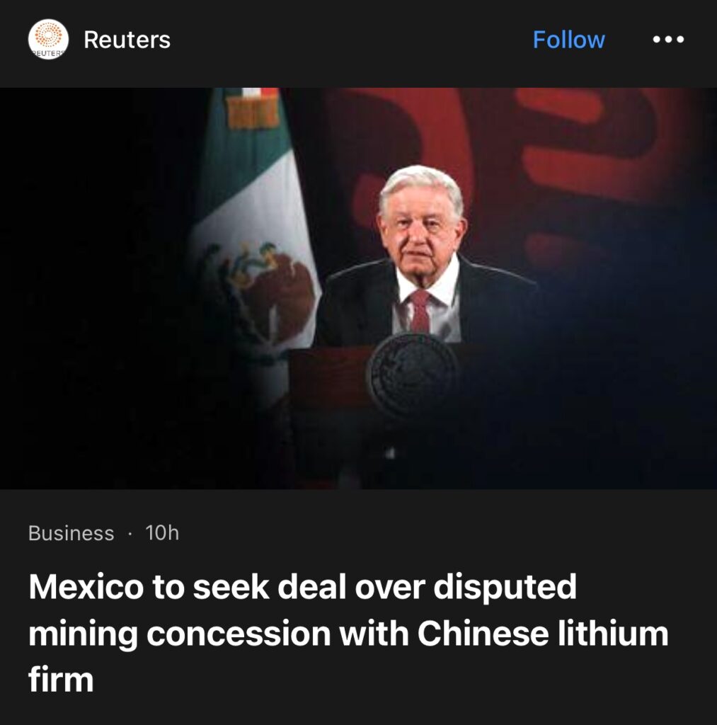 6。据墨西哥城路透社报道,墨西哥总统安德烈斯·曼努埃尔·洛佩斯·奥夫拉多尔周四表示,在中国锂矿企业赣锋锂业就有争议的特许权提起仲裁后,墨西哥政府将寻求与该公司达成协议,同时仍捍卫墨西哥的权利。