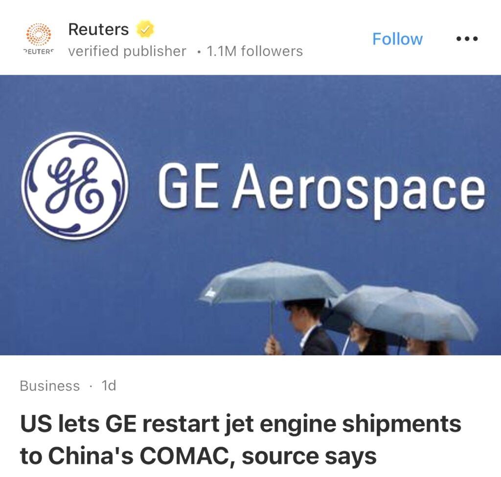 10。(路透社)——据知情人士透露,美国周四告知通用电气航空航天公司 (GE Aerospace),它可以重启向中国商飞公司发货喷气发动机,这进一步表明中美贸易紧张局势正在缓和,其中包括北京在稀土问题上做出的让步。