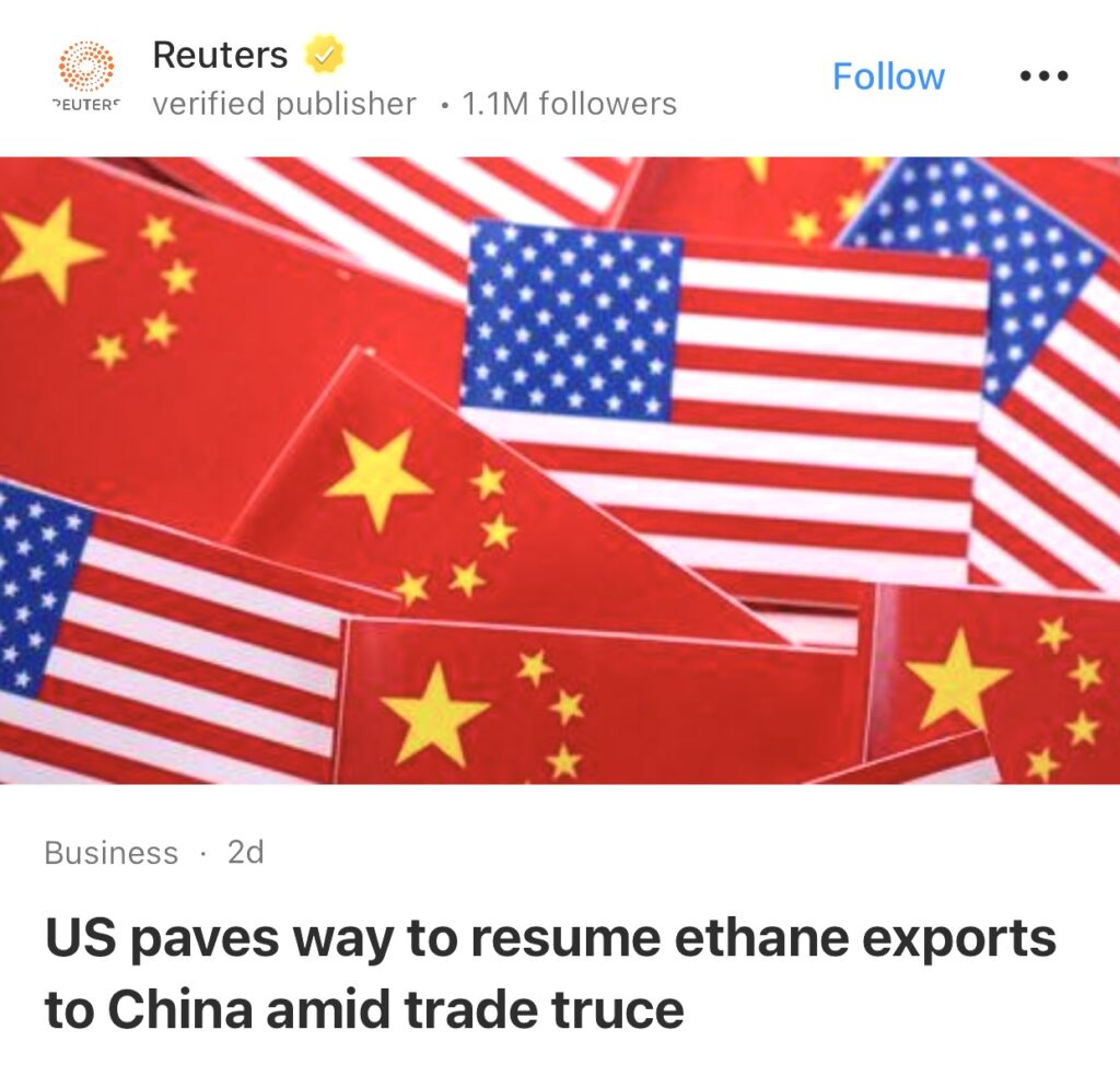 11。休斯顿(路透社)——美国周三为恢复向中国出口乙烷扫清了道路,向生产商 Enterprise Products Partners 和 Energy Transfer 发出信函,撤销几周前实施的限制性许可要求,这表明美中贸易休战正在按计划进行。