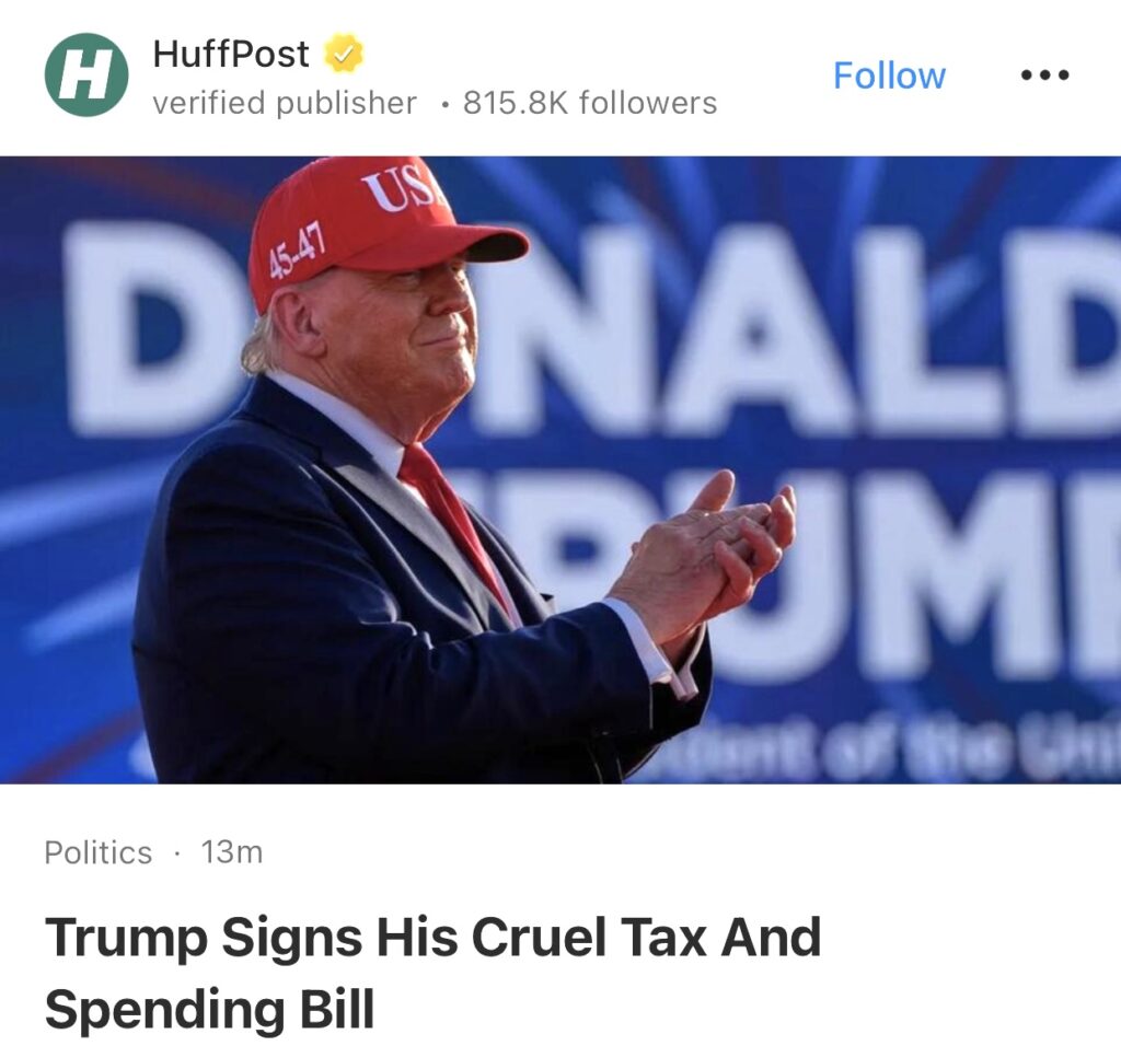 7。据HuffPost周五报道,唐纳德·特朗普总统签署了他所谓的“宏大而美丽的法案”,使其成为法律,标志着他的政府取得了一项重大立法胜利。