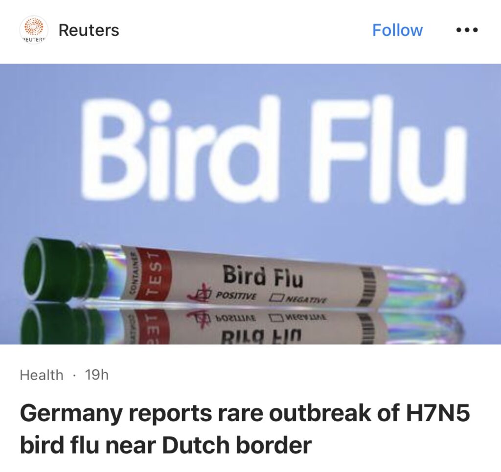 10。据巴黎路透社报道,世界动物卫生组织(WOAH)周四表示,德国报告该国西部靠近荷兰边境的一个农场爆发罕见的高致病性H7N5禽流感疫情。