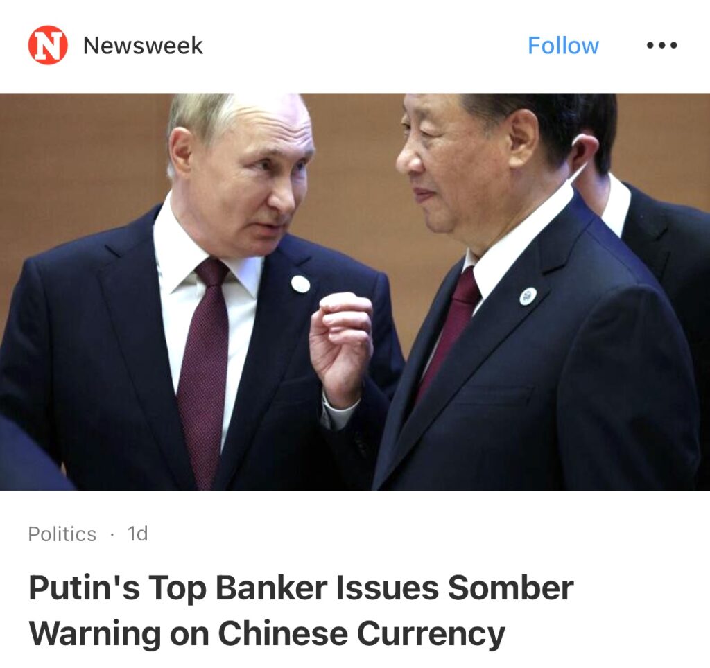 1。据Newsweek报道,普京最高银行家对人民币发出严峻警告。俄罗斯可能无法像最初希望的那样依赖人民币,因为北京的银行被迫遵守美国的规定。俄罗斯中央银行行长纳比乌林娜周四表示,支付问题是俄罗斯经济面临的主要挑战之一。俄罗斯央行正在考虑所有可能的风险,包括暂停人民币交易所交易的风险。
