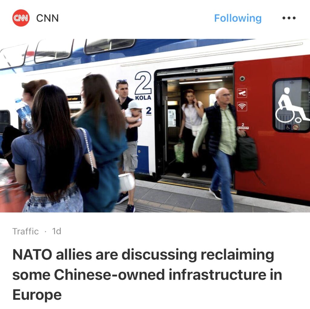 11。据CNN 报道,三名参与讨论的官员告诉美国有线电视新闻网,北约官员正在讨论,如果欧洲大陆东部与俄罗斯爆发更广泛的冲突,将采取行动收回一些中国在欧洲拥有的基础设施项目。