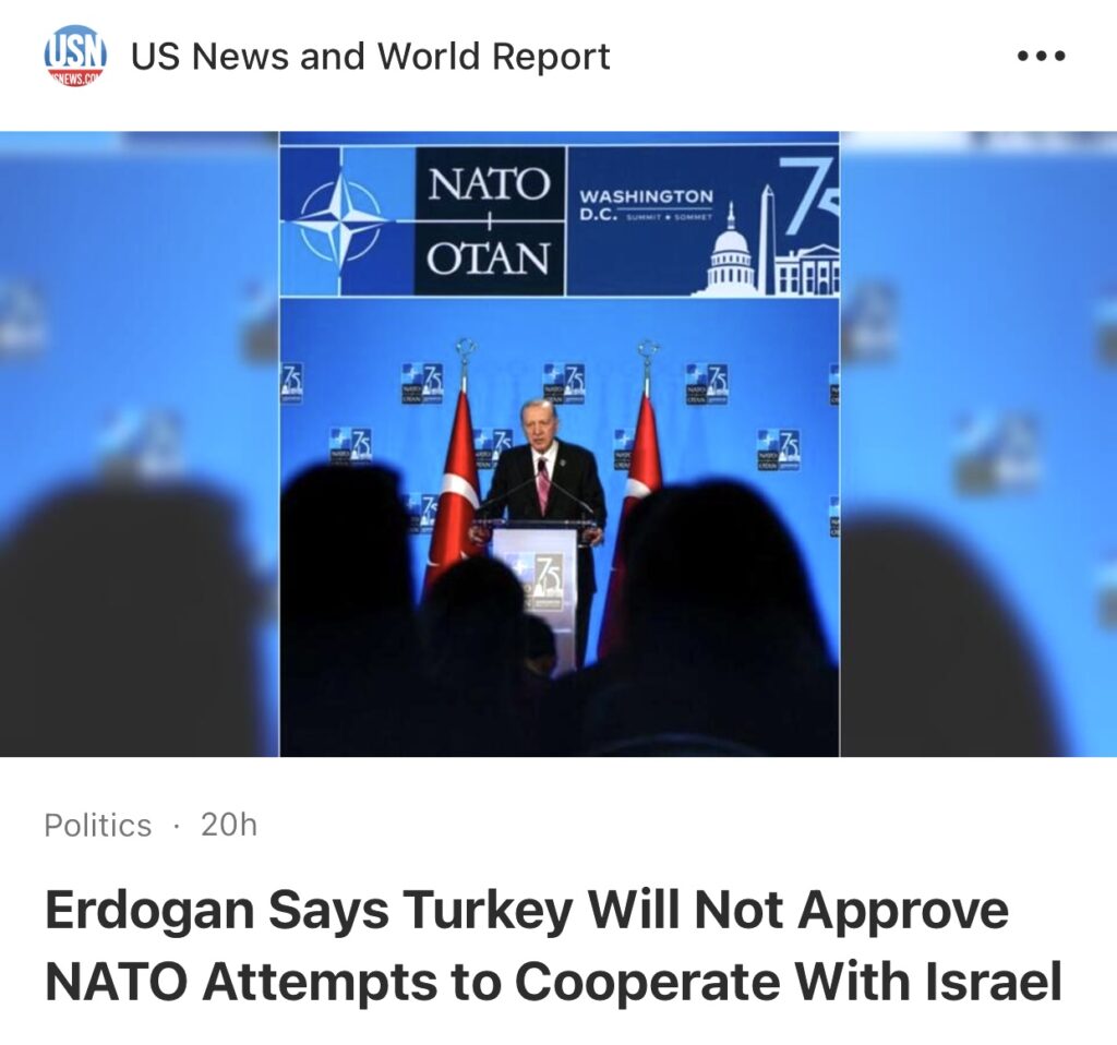 12。据伊斯坦布尔路透社报道,土耳其总统塔伊普·埃尔多安周五表示,北约不可能继续与以色列政府建立伙伴关系。埃尔多安在北约峰会新闻发布会上表示:“在巴勒斯坦建立全面、可持续的和平之前,土耳其不会批准在北约内与以色列合作的尝试。”