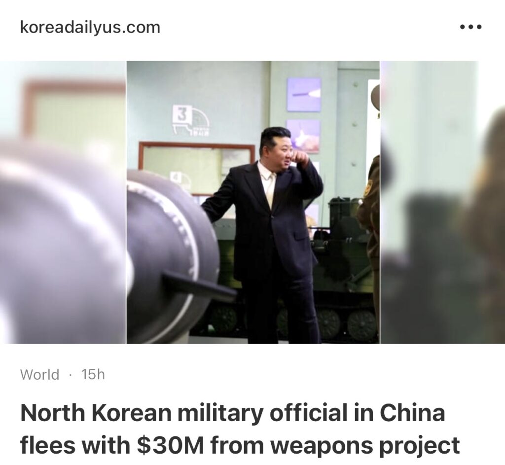 4。据TheKoreaDaily 报道,驻华朝鲜军官携武器项目3000 万美元潜逃。据报道,一名负责管理朝鲜”武器现代化”项目资金的高级军官上个月贪污了 3000 万美元并潜逃。这一金额占朝鲜领导人金正恩为现代化项目分配的1 亿美元基金的 30%。