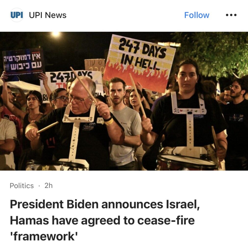 10。据7 月 12 日UPI报道,总统乔·拜登周五表示,以色列和哈马斯已就停火和释放人质的计划框架达成一致。