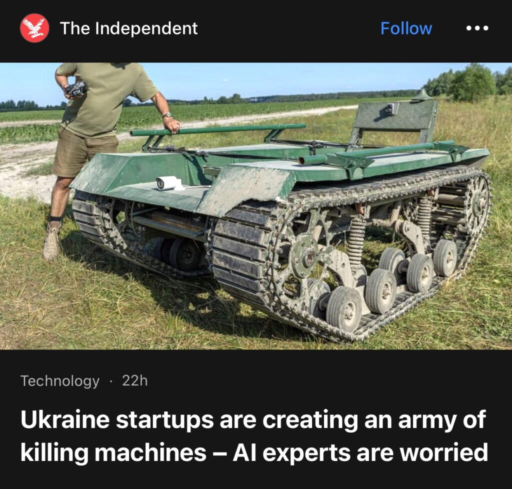 4。据The Independent报道,乌克兰初创公司正在打造一支杀戮机器大军——人工智能专家感到担忧。乌克兰数百个秘密车间中的实验室生态系统正在利用创新来创建一支机器人军队,乌克兰希望这支机器人军队能够消灭俄罗斯军队,并拯救本国受伤的士兵和平民。