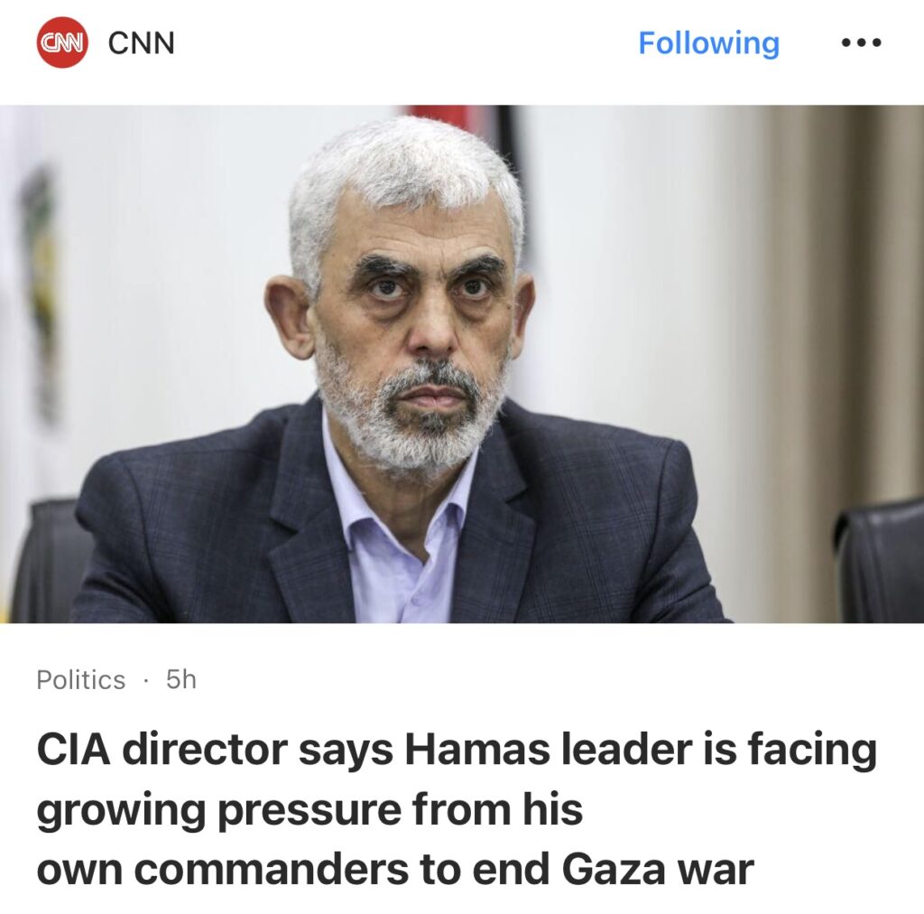 10。据CNN 报道,中央情报局局长表示,哈马斯领导人面临着来自其指挥官的越来越大的压力,要求结束加沙战争。