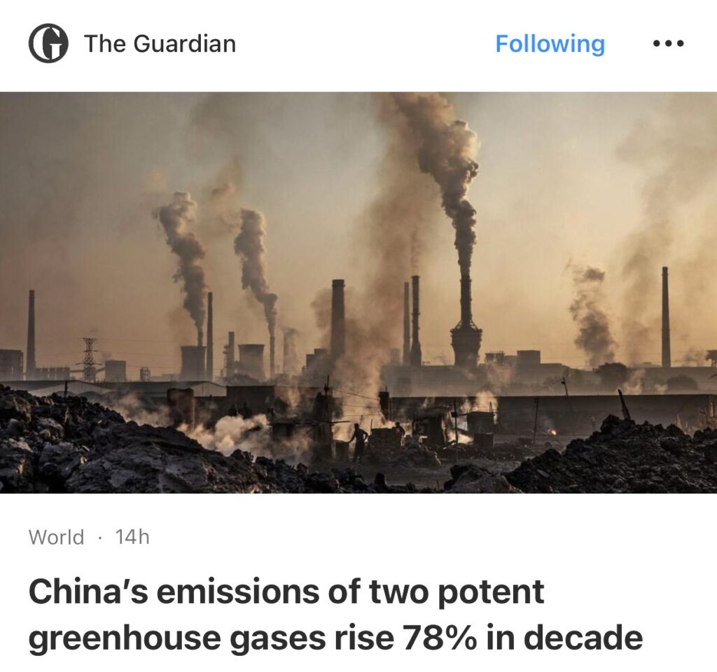 13。据The Guardian报道,十年来中国两种强效温室气体排放量增加78%。麻省理工学院 Minde An 领导的研究小组检查了两种特定全氟化碳(四氟甲烷和六氟乙烷)的排放量,这两种物质在大气中的寿命分别为50,000 年和 10,000 年。