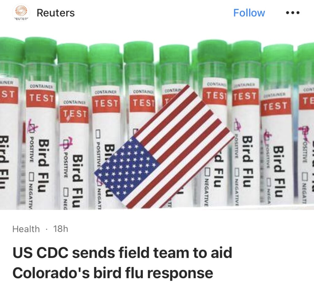 1。据Fortune报道,科罗拉多州农场爆发禽流感,5名工人检测呈阳性,据 CDPHE 发言人称,现场还有约50 人出现了病毒症状,这些工人的检测结果正在等待中。专家警告“转折点”出现,呼吁采取紧急行动。