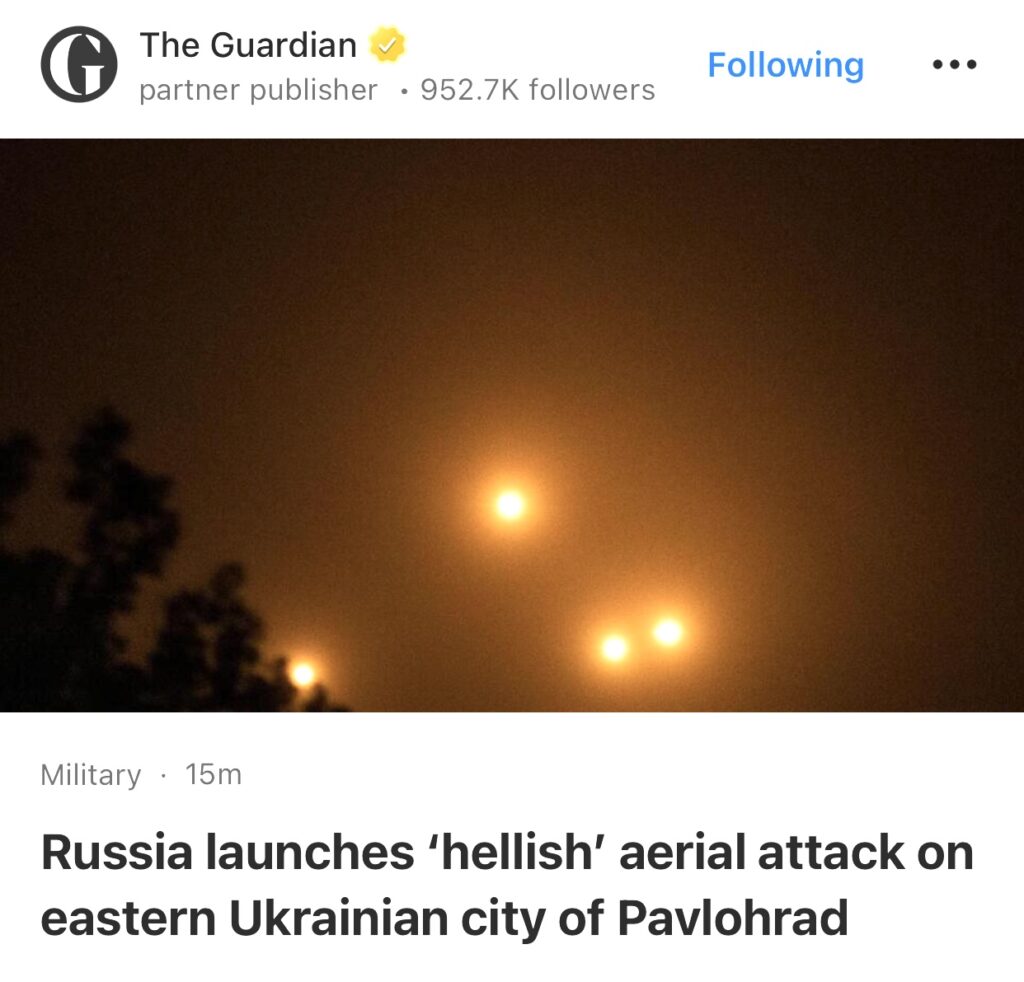 10。据The Guardian报道,俄罗斯对乌克兰东部城市巴甫洛格勒发动“地狱般”空袭。