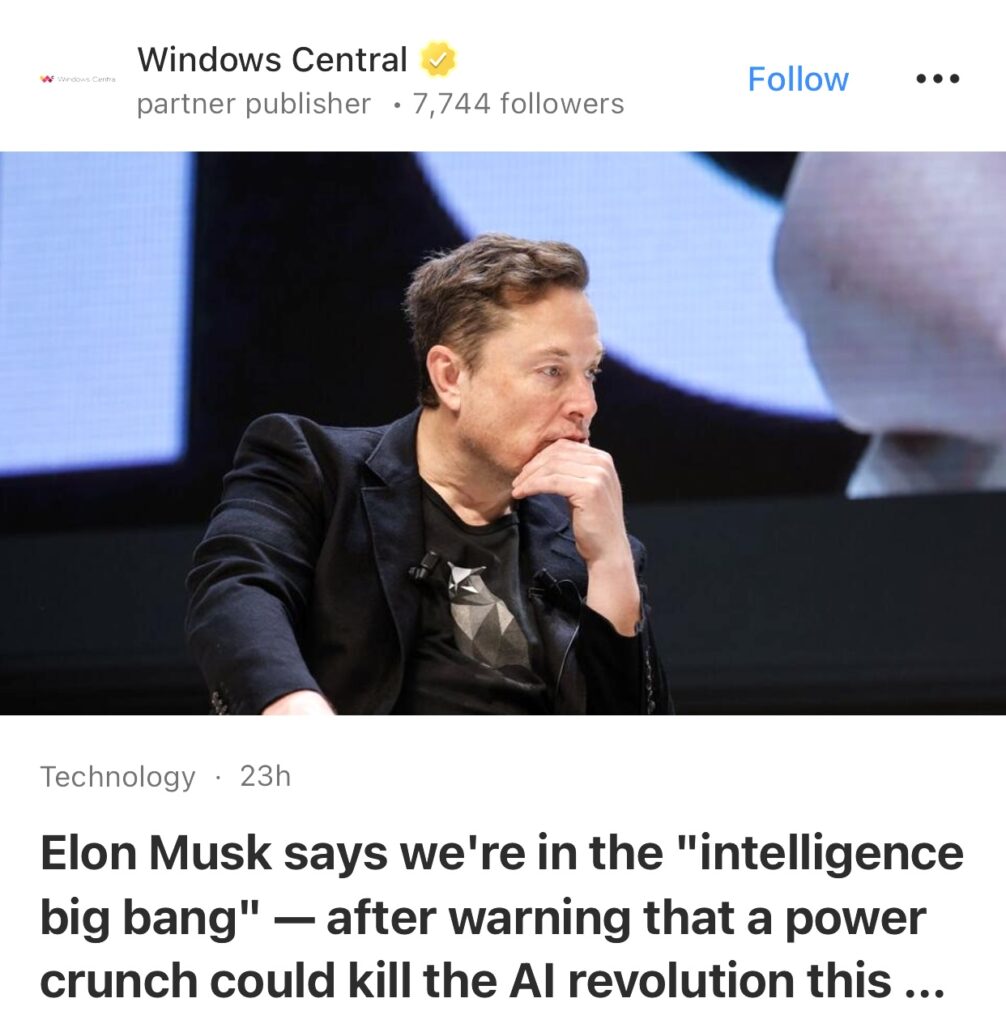 9。据Windows Central报道,埃隆·马斯克表示,我们正处于“智能大爆炸”之中——此前他曾警告称,今年的电力危机可能会扼杀人工智能革命。