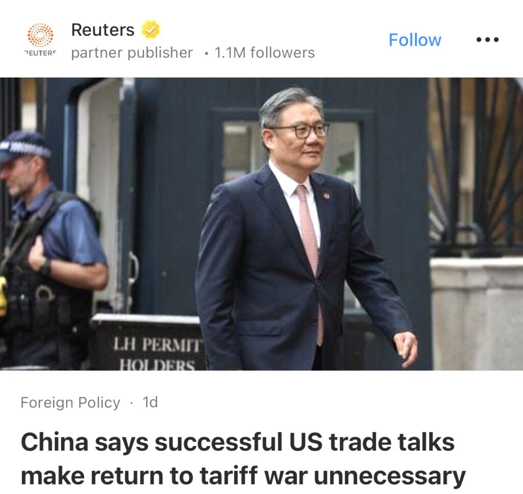 8。据Reuters报道,中国称美中贸易谈判成功,无需重启关税战。
