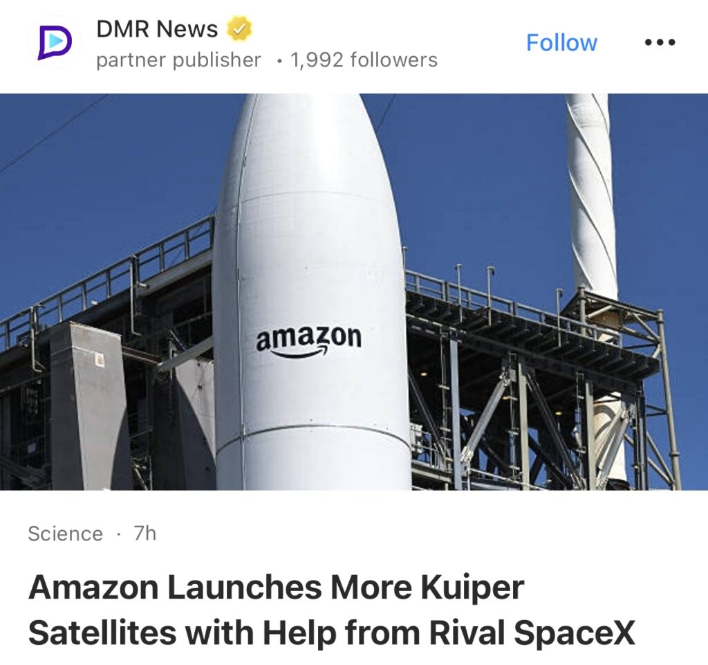3。据DMR News报道,亚马逊在竞争对手 SpaceX 的帮助下发射更多柯伊伯卫星。