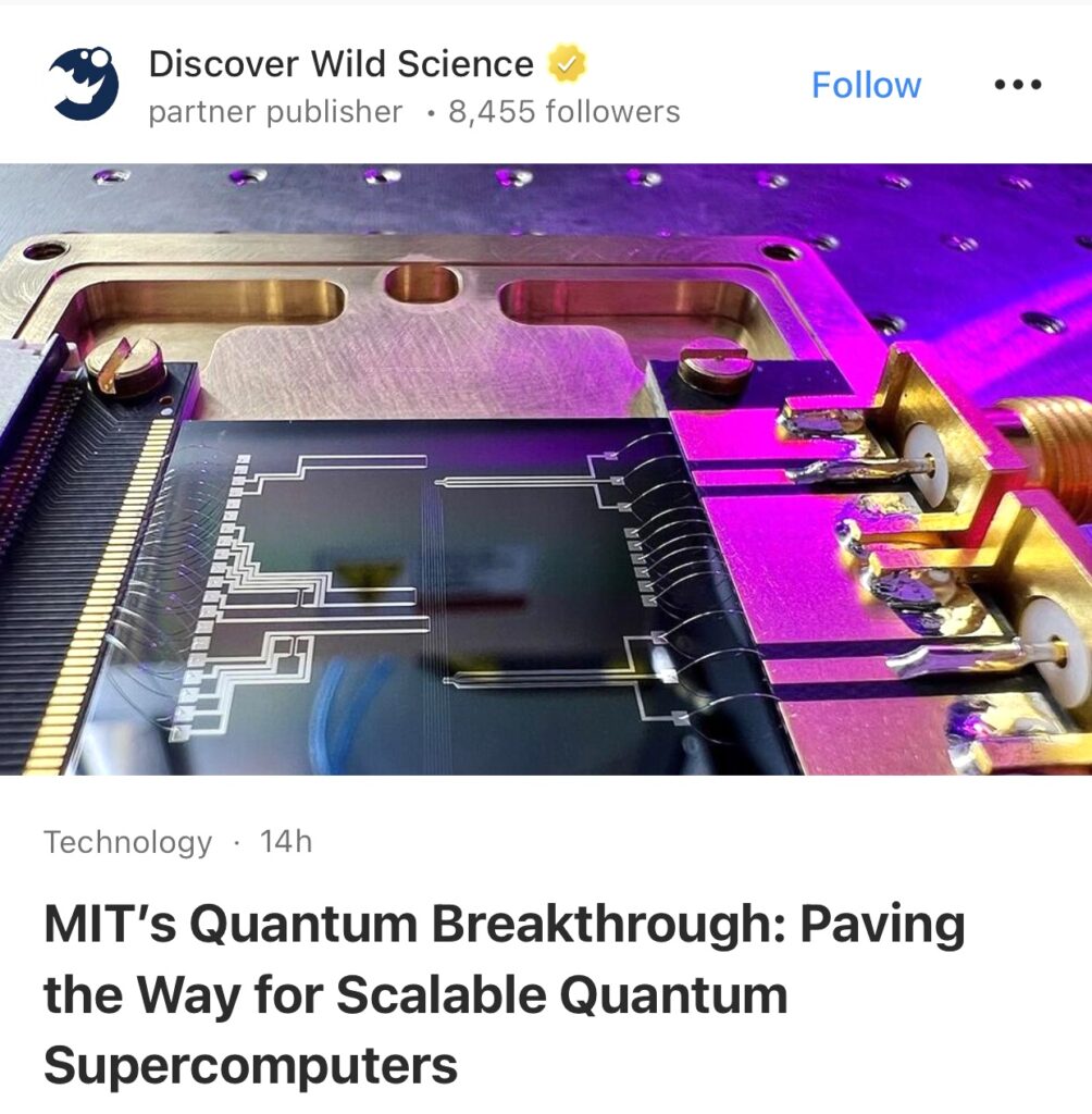 1。据Discover Wild Science报道,麻省理工学院的量子突破,为可扩展量子超级计算机铺平道路。