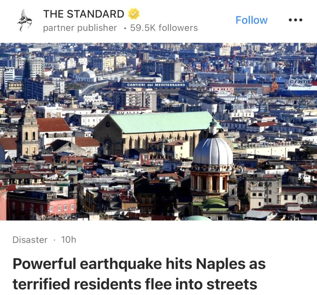 4。据THE STANDARD报道,强烈地震袭击了意大利南部城市那不勒斯,惊恐的居民逃到街上。
