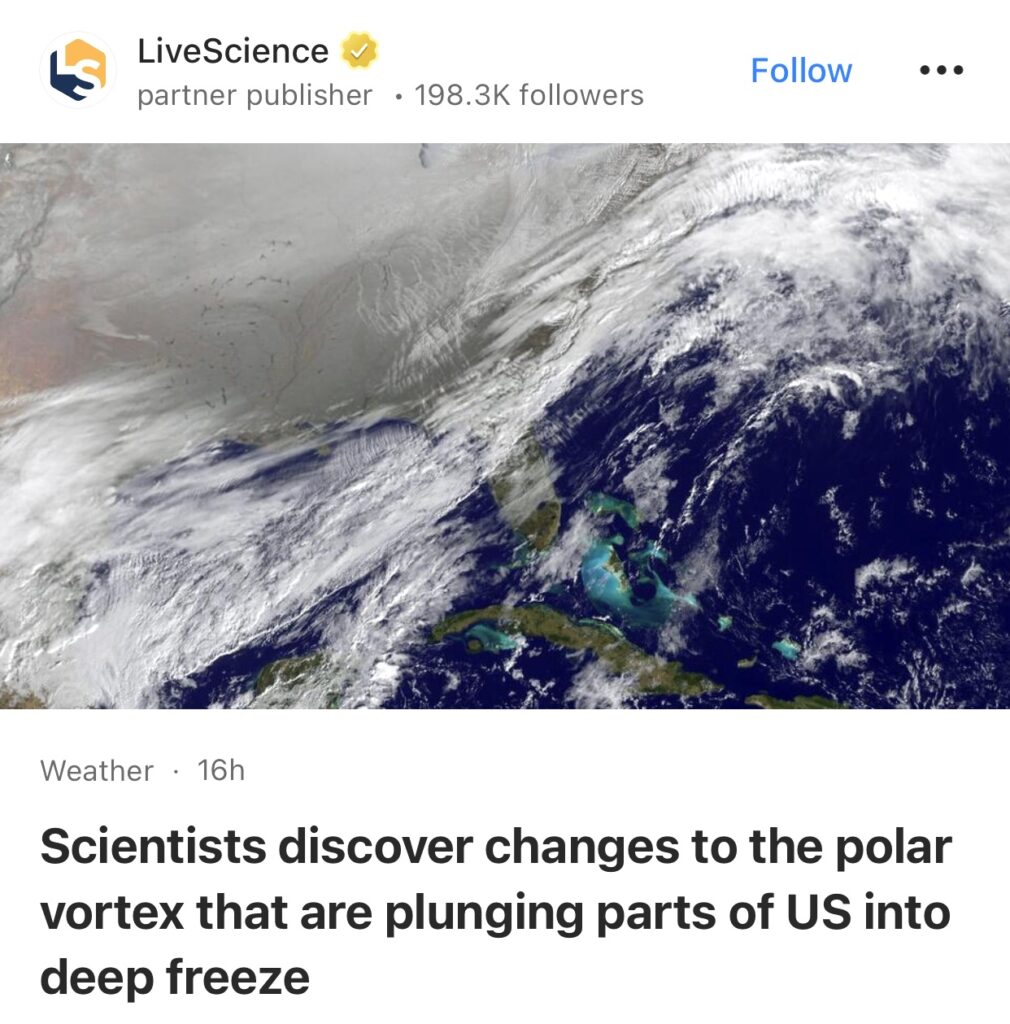 11。据LiveScience报道,科学家发现极地涡旋的变化导致美国部分地区陷入深度冻结。