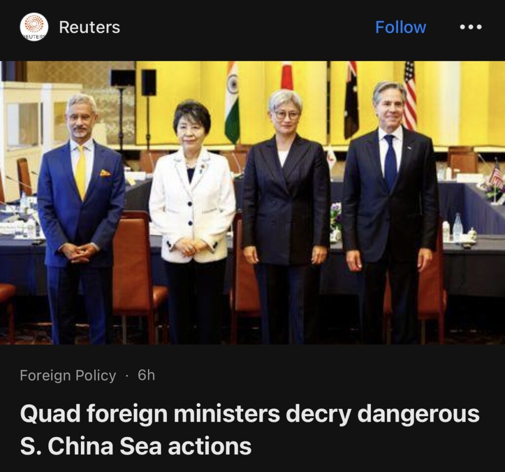 11。据东京路透社报道,澳大利亚、印度、日本和美国的外交部长周一表示,他们对南中国海的恐吓和危险行为感到严重关切,并承诺加强该地区的海上安全。