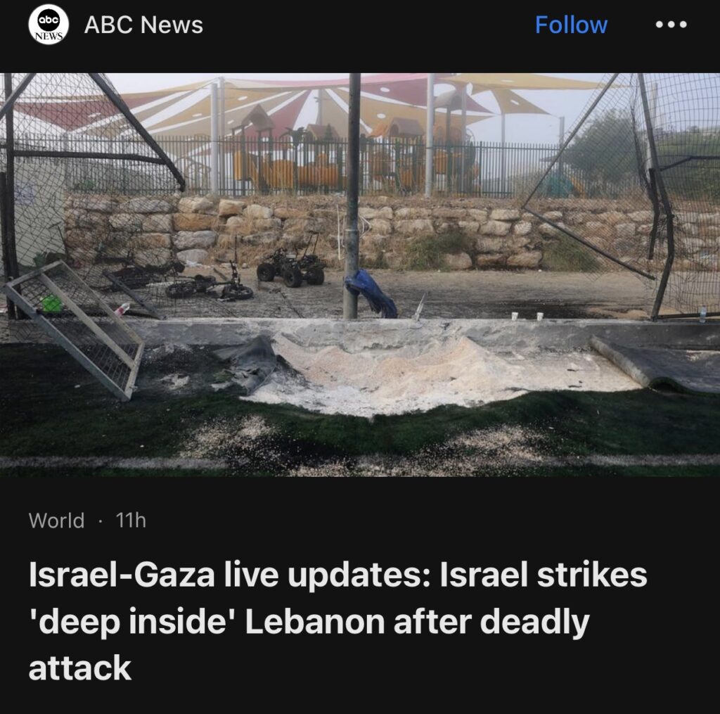 6。据ABC News报道,以色列在被致命袭击后,袭击了黎巴嫩“深处”。据以色列总理办公室称,以色列总理本杰明·内塔尼亚胡和国防部长约夫·加兰特周日被授权决定对真主党据称袭击戈兰高地迈季代勒沙姆斯镇的事件作出反应的方式和时间。