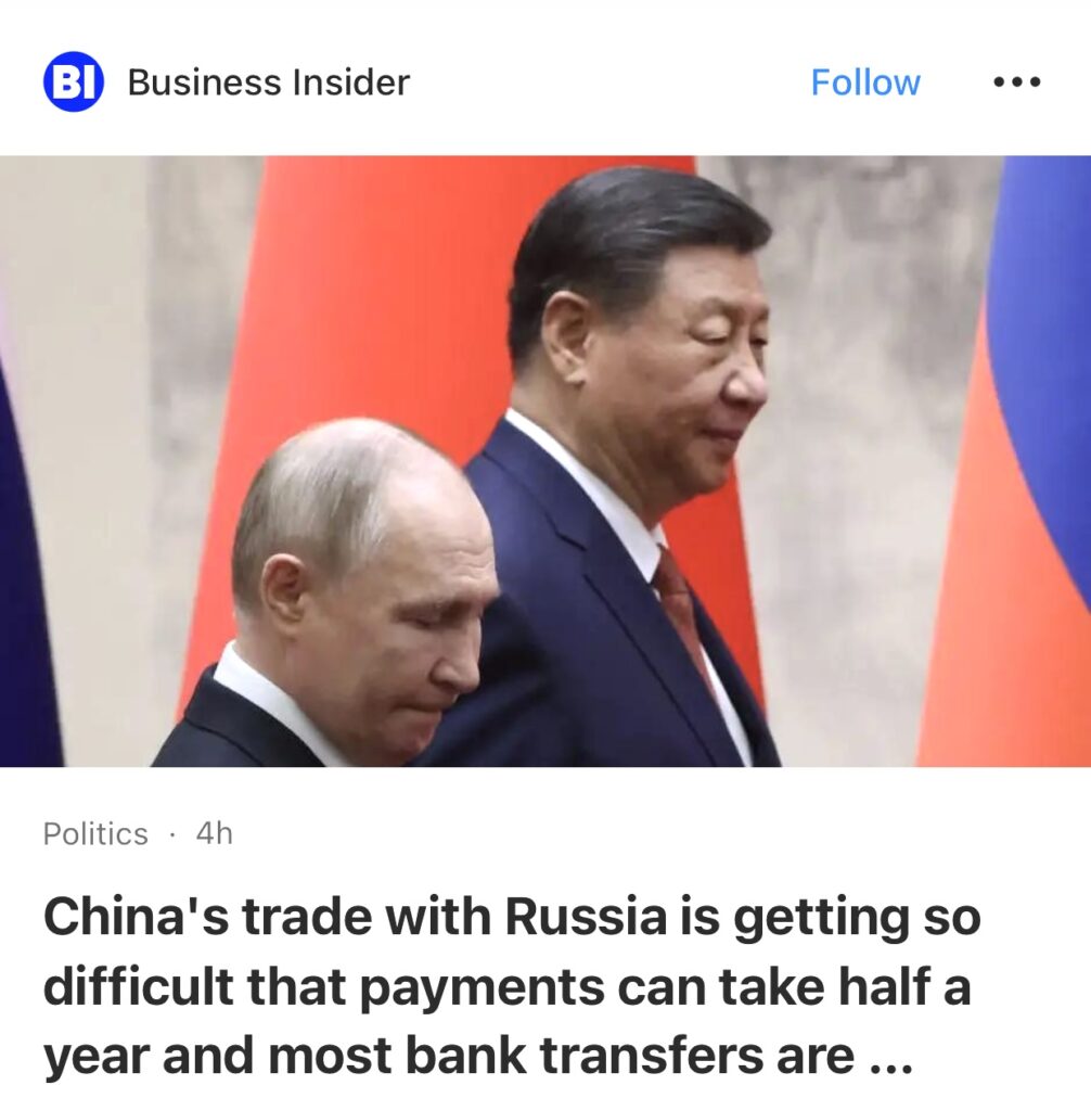 12。据Business Insider报道,中国与俄罗斯的贸易变得如此困难,付款可能需要半年时间,大部分银行转账都被退回。